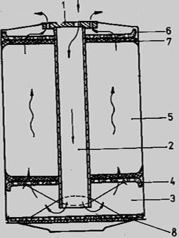 1-Junta perforada que une el Distribuidor y el canister 2-Tubo hueco por donde pasa el gas con CO2 3-Espacio vacío 4 Colador 5-Absorbente 6 Colador 7-Filtro 8-Base Invertida |